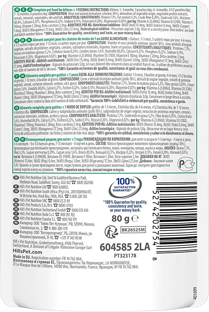 Hill’s Science Plan Healthy Cuisine provides 100% balanced and healthy nutrition while offering an irresistible taste that your kitten will love. Made with high quality ingredients. High quality protein for lean muscles and antioxidants to support the immune system. Science Plan Healthy Cuisine Stews can be fed alone, mixed with dry food or used as a savoury topper to entice your kitten. Helps hydration*. *Please provide fresh water for your pet at all times.